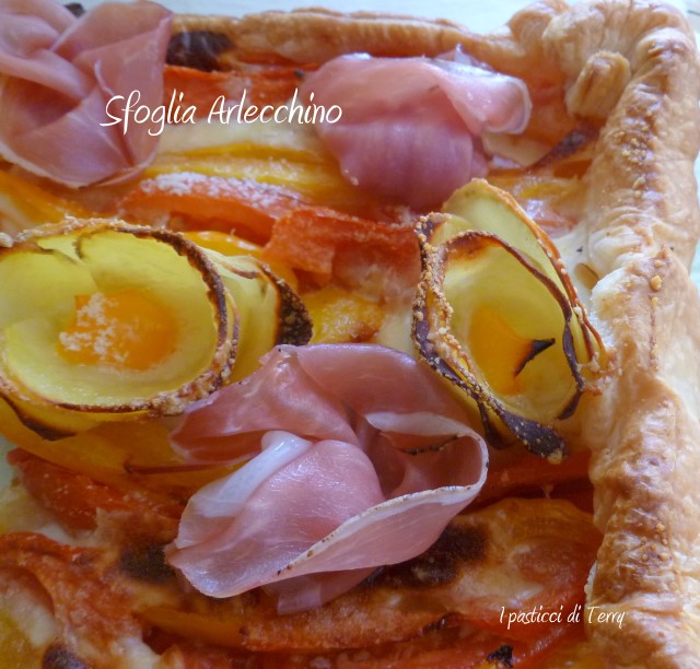 Avevo un peperone giallo, un pomodoro rosso. Avevo del formaggio a fette e via, strada facendo ho “costruito” questa Torta salata. Poi ho immaginato i sapori della patata, peperone, pomodoro e formaggio e mi sono detta che una nota affumicata ci sarebbe stata molto bene e così, una volta sfornata, ho aggiustato delle fette di speck sopra. Il calore delle verdure ha ammorbidito lo speck, che ha rilasciato tutto il suo profumo e il sapore, all’interno della Torta salata. Ti assicuro che questa Sfoglia Arlecchino è golosa e molto profumata. Si farà mangiare senza nessun sacrificio.