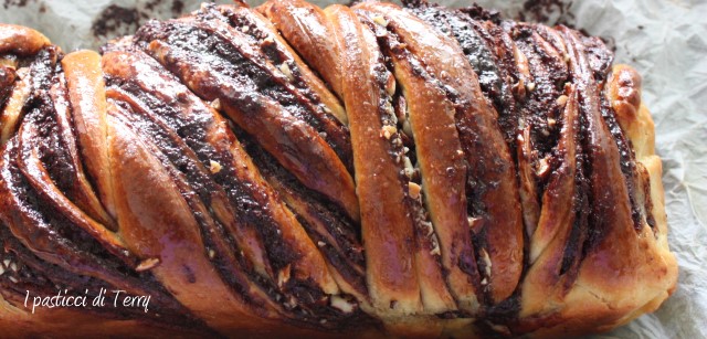 La Babka è un dolce simile al pan brioche molto diffusa nell’Europa orientale;esiste anche una versione ebraica legata alla tradizione pasquale e penso che sia questa versione presa in considerazione dalle admin del gruppo re-cake ispirandosi ad una ricetta del blog il “Cavoletto di Bruxelles”. Una cosa è certa, questa ricetta in casa mia, si farà di nuovo, magari variando o arricchendo la farcitura a piacere, a seconda della voglia del momento. Rispetto alla ricetta originale ho solo diminuito la quantità di lievito indicata e sostituito le noci pecan (che non avevo ma la prossima volta voglio provare) con le mandorle. Inoltre ho tritato fine fine delle scorzette di arance, le ho stemperate con dell’acqua e messe sul fuoco. Fino a ottenere un liquido spesso, che poi ho allungato con due cucchiai di acqua, per renderlo spalmabile con un pennello. La ricetta originale prevede acqua di arance, che io non avevo. Ecco la mia Babka.