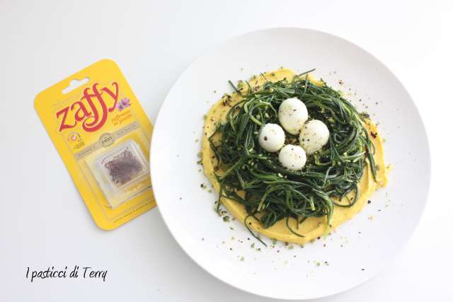 Agretti con salsa allo zafferano ovette di quaglia e pistacchi
