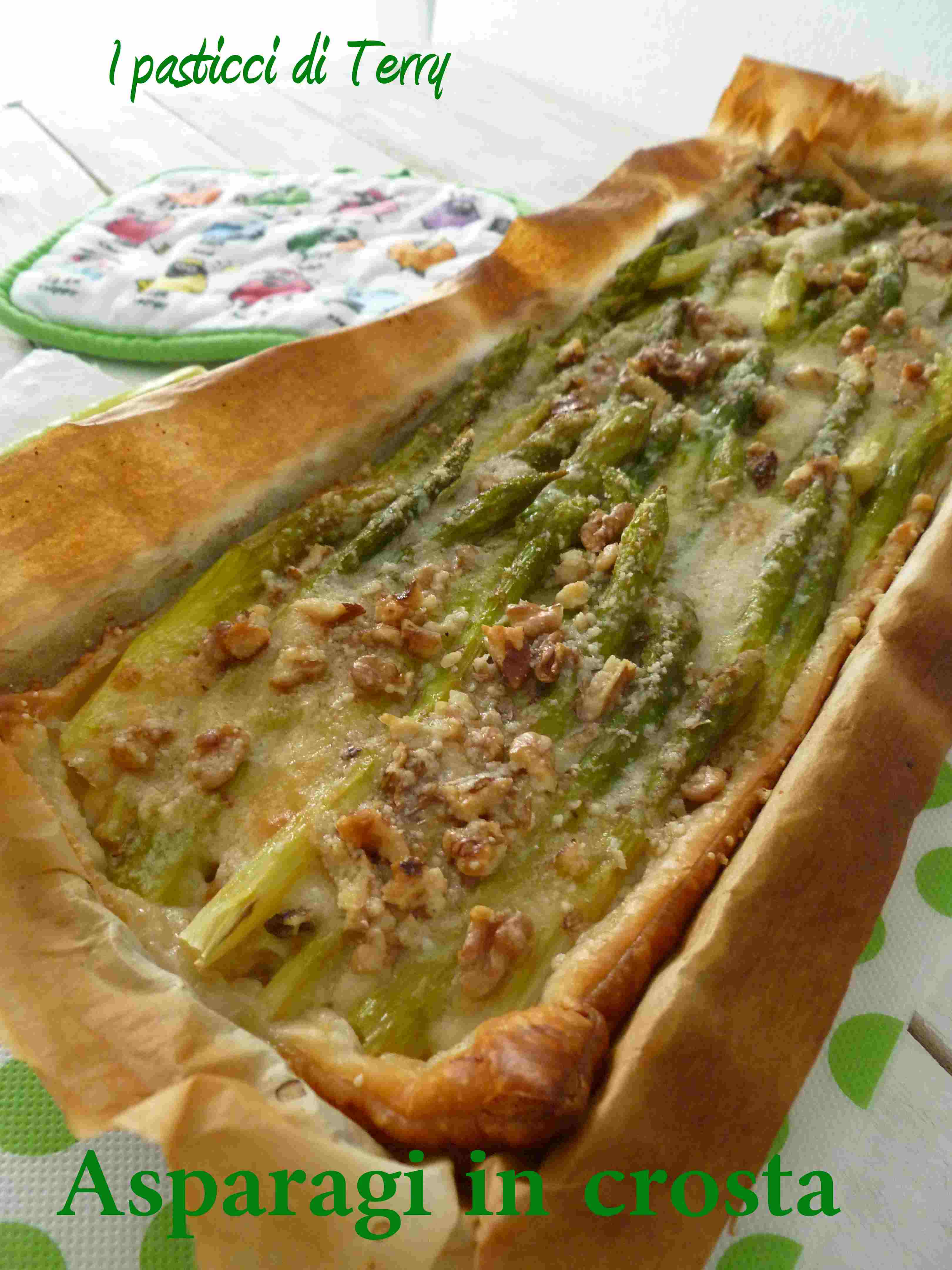 Oggi vi voglio lasciare una delle mie ricette di recupero. Nata così per caso. Avevo comprato un mazzo di asparagi, che tra l’altro adoro. Avevo il solito pezzo di formaggio: gira sempre quell’ultimo pezzo in frigorifero. Inoltre ho un bel po’ di noci ancora da far fuori. Ed ecco quindi che oltre ad averle messe nella Salsa caramellata del gelato alle noci, ho pensato di metterne una manciata, sopra a questi stupendi Asparagi in crosta. La crosta? Anche questo un pezzetto di Sfoglia (ma poca poca eh? Giusto 200 grammi) che mi girava nel frigo. L’avevo tirata fuori dal freezer, quando ho fatto i Fagottini, la porzione surgelata era troppa e ne avevo avanzato giusto questi 200 gr. Insomma oggi ti presento una della tante mie ricette del riciclo. Gli Asparagi in crosta alla mia maniera.