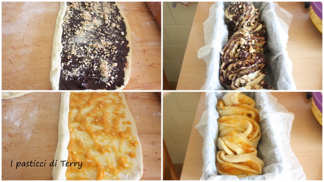 Sistemare questo treccione in uno stampo da 22×10 rivestito di carta forno, prima bagnata e strizzata oppure imburrato. Lasciar raddoppiare. A me ci sono volute tre ore. Fare la stessa cosa con l’altra parte dell’impasto. Io l’ho farcita con un vasetto (circa 300 g) di marmellata di arance fatta da me.