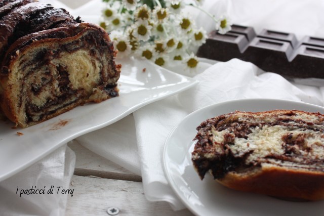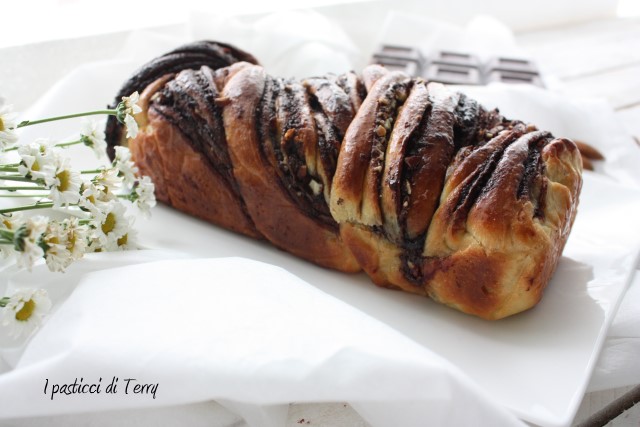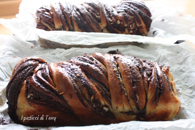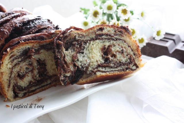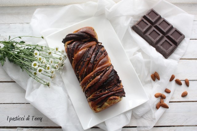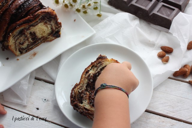 La Babka è un dolce simile al pan brioche molto diffusa nell’Europa orientale;esiste anche una versione ebraica legata alla tradizione pasquale e penso che sia questa versione presa in considerazione dalle admin del gruppo re-cake ispirandosi ad una ricetta del blog il “Cavoletto di Bruxelles”. Una cosa è certa, questa ricetta in casa mia, si farà di nuovo, magari variando o arricchendo la farcitura a piacere, a seconda della voglia del momento. Rispetto alla ricetta originale ho solo diminuito la quantità di lievito indicata e sostituito le noci pecan (che non avevo ma la prossima volta voglio provare) con le mandorle. Inoltre ho tritato fine fine delle scorzette di arance, le ho stemperate con dell’acqua e messe sul fuoco. Fino a ottenere un liquido spesso, che poi ho allungato con due cucchiai di acqua, per renderlo spalmabile con un pennello. La ricetta originale prevede acqua di arance, che io non avevo. Ecco la mia Babka.
