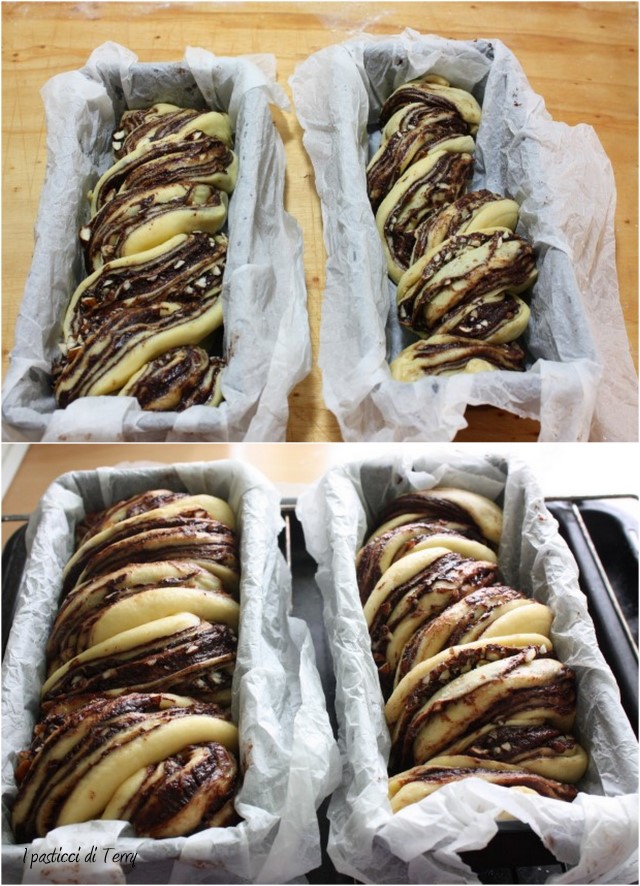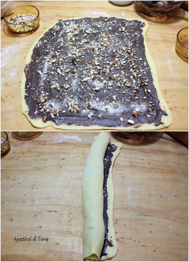 Riprendere l’impasto, dividerlo a metà, stendere una metà in un rettangolo di circa 30x40cm. Spalmarlo con metà della crema di cioccolato, cospargere con 1 cucchiaio di zucchero e metà delle mandorle. Arrotolare sul lato più lungo, poi tagliare il rotolo per metà nella lunghezza e intrecciare le due metà. Disporre la treccia ottenuta nella teglia da 22x8cm (foderata con della carta forno). Ripetere tutto ciò con l’altra metà dell’impasto.