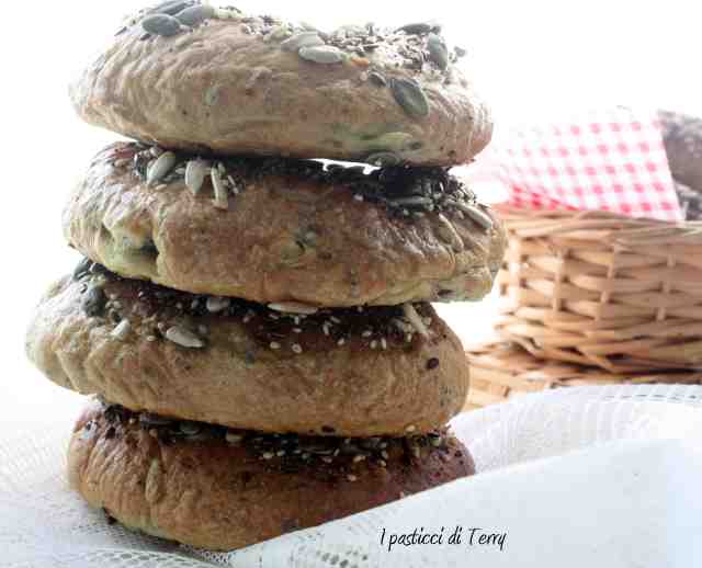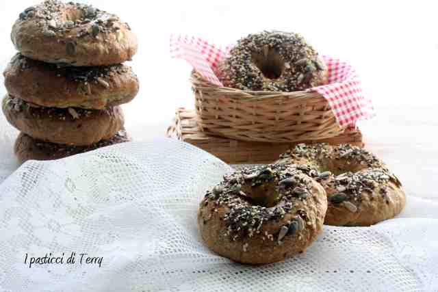 Sono semplici da preparare, anche se è prevista una bollitura di un minuto per lato. Essendo un lievitato dovete prevedere anche i tempi di lievitazione. Per avere un prodotto più digeribile, potete preparare anche l’impasto la sera, con pochissimo lievito e poi continuare la lavorazione il mattino dopo. Grazie Annalaura e grazie anche alla mia amica Lina, per la ricetta. Bagel con semi misti
