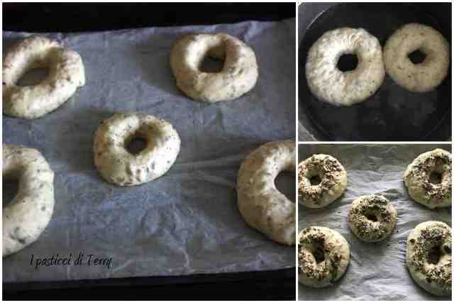 Nel frattempo mettere a bollore dell’acqua in una pentola, salarla leggermente. Accendere il forno a 220° . Passata la mezz’ora adagiare delicatamente una ciambella alla volta, nell’acqua a bollore. Lasciare circa un minuto per parte e poi scolare direttamente sulla carta forno. Spennellare con del latte (o se preferite un colore più dorato con un uovo), decorare con altri semi misti e infornare per circa 20/25 minuti.