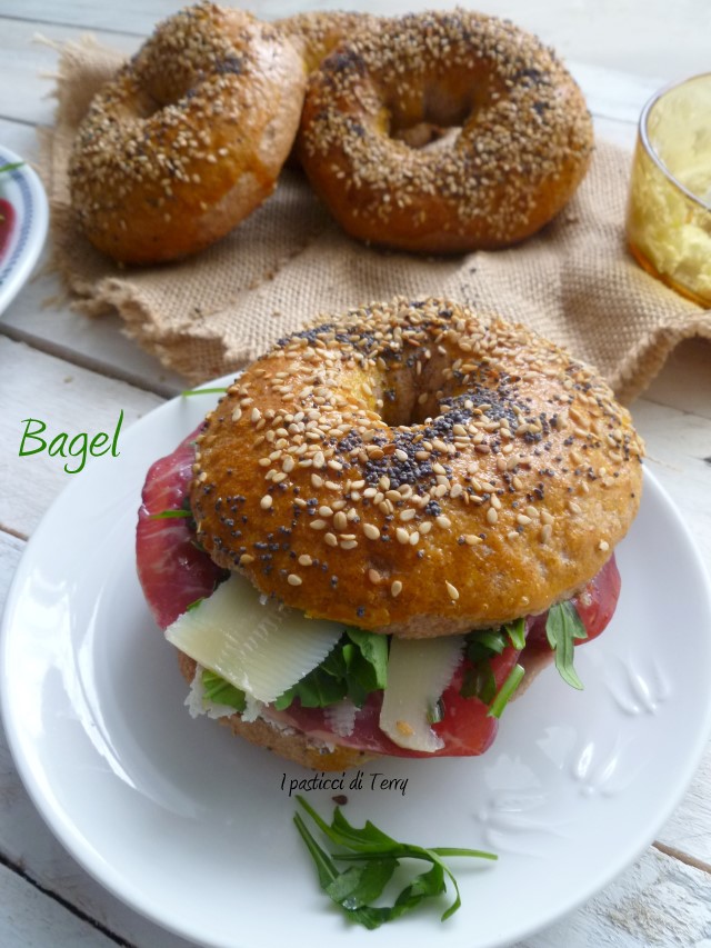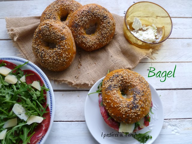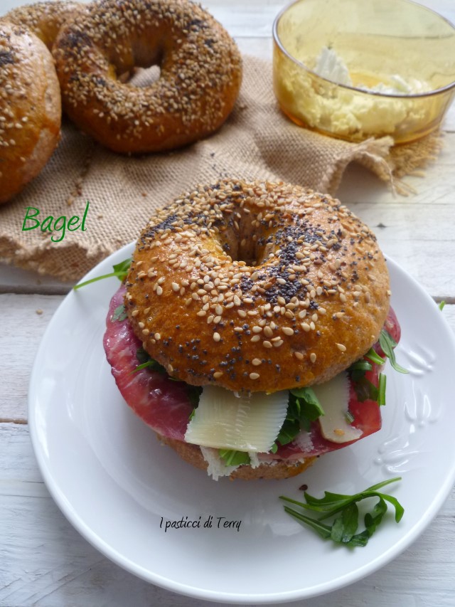 Ormai lo saprete tutti; Re-cake è un bellissimo modo di unire tante amiche blogger che ogni mese preparano la stessa ricetta, con solo poche variazioni possibili. Questo mese l’unica deroga alla ricetta proposta era la farcitura. E devo dire meno male perché a mio marito non sarebbe piaciuta quella farcitura a base di salmone. Mi seccava farla solo per me alla fine … quindi tutti e due ci siamo pappati un buonissimo Bagel con bresaola, formaggio e rucola.
