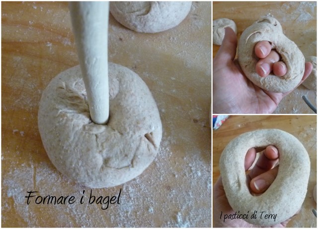 Al mattino dopo, mettere l’impasto sul piano infarinato, dividere in sei pezzi di ugual misura. Formare i bagel con la classica forma a ciambella. Io ho usato il fondo di un cucchiaio di legno e poi con le mani, ho allargato il buco, dandogli una forma a ciambella.