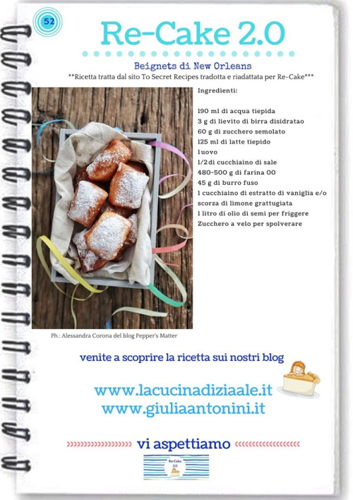 Beignets di New Orleans. Questo mese le amiche della Re-cake2.0 ci portano a New Orleans per delle buonissime frittelle di Carnevale. Già quando le ho viste mi prudevano le mani ma mi sono detta: no dai, non posso farle altrimenti ne mangerei a chili e non va bene, se devi perdere qualche chilo. Poi, complice una domenica in famiglia, è arrivata l’occasione per dividerle e mangiarne quindi poche. Perciò mi è toccato farle 🙂