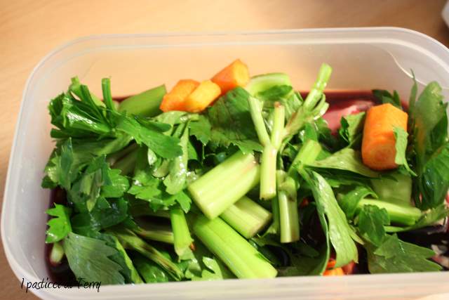 Il giorno prima mettere in una ciotola stretta e a misura del pezzo di carne, il manzo e tutte le verdure a pezzi grossi, aggiungere anche tutte le erbe aromatiche, coprire con il vino rosso, coprire e mettere in frigorifero.