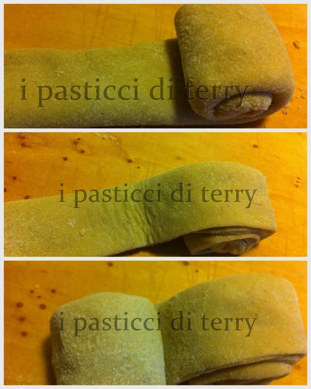 Ho rovesciato il mio impasto bello “bolloso” sul piano leggermente infarinato, formato un quadrato con le mani e poi con il matttarello ho steso creando un rettangolo 50×25 circa (ebbene si, ho preso il metro per voi!)