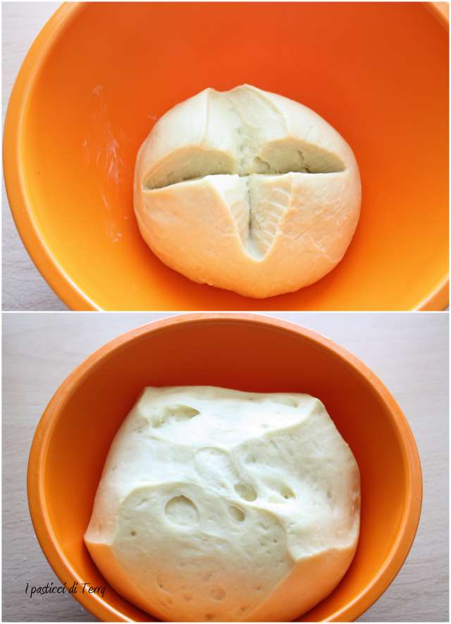 Formare una palla e sistemarla in una ciotola a lievitare, coperto, fino al raddoppio. Qui non vi posso dare tempi, ormai lo sapete. Se impastate, come me, la sera, al mattino troverete l’impasto pronto per essere finito. Quindi all’incirca 8 ore ma è relativo.