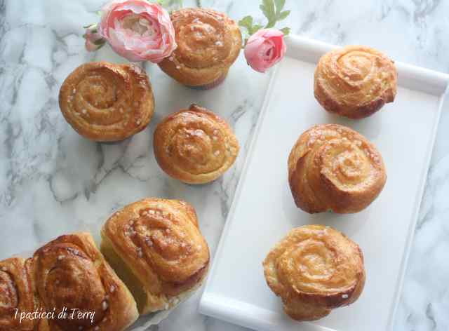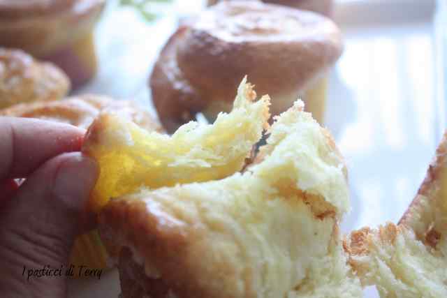 Ciao Terry ti sono venute davvero belle queste brioche sfogliate, le avevo viste e la procedura mi sembrava elaborata, mi sarei cimentate se non avessi troppe scadenze ed eventi da gestire che riducono il mio tempo libero a zero. Mi godo le tue anche se mi dispiace non poterle assaggiare sono così invitanti.