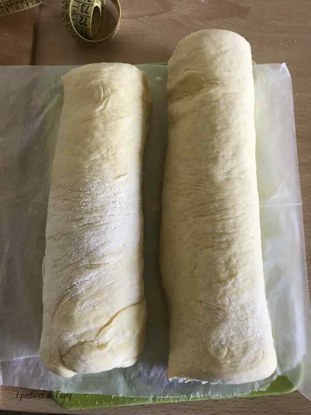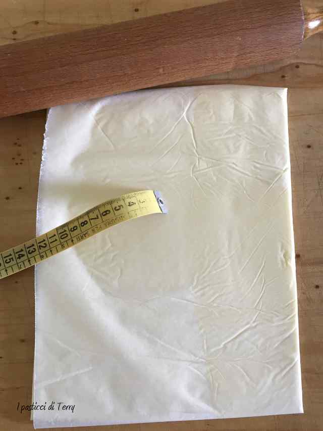 Girare la pasta dal lato corto e stendere di nuovo a rettangolo di circa 60×70. Piegare a libro, portando il lato sotto al centro e piegare quello sopra. Ruotare di nuovo di 90° in modo da avere la chiusura sul lato destro. Chiudere in pellicola e riporre in frigo per circa 20 minuti. In pratica come si fa per la Pasta sfoglia. Ero convinta di aver fatto tutte le foto dei passaggi e invece non me le trovo. Comunque guardate questo articolo, le pieghe sono uguali.