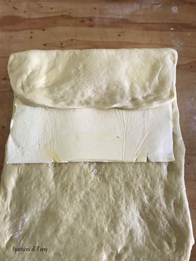Una volta lievitato, riprendere l’impasto, spolverare di farina il piano e formare un rettangolo di circa 45×25. Mettere il panetto di burro preparato al centro e ripiegare la pasta al centro, per sigillare il burro.