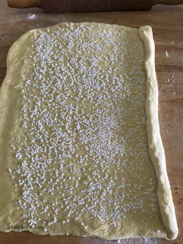 Ripetere di nuovo; formare un rettangolo di 60×70, piegare a libro, girare a 90° e di nuovo in frigo e così una terza volta. Aiutatevi spolverando leggermente il piano di farina. Non esagerate altrimenti ci sarà troppa farina. Dopo il terzo giro e il terzo riposo, riprendere l’impasto e stenderlo di nuovo, formando di nuovo un rettangolo di circa 35×45. Cospargere con la granella di zucchero, tenendo liberi i 3 cm in basso (nel mio caso su un lato, visto che il lato lungo era orizzontale).