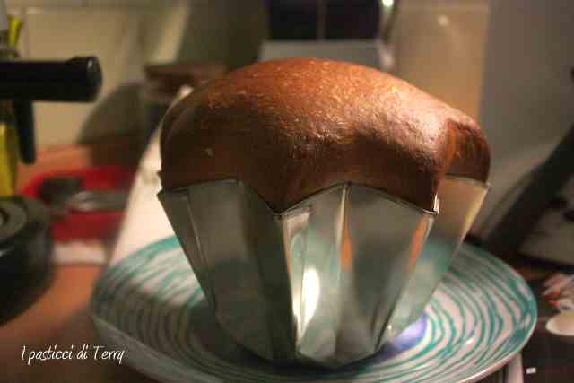 Coprire e mettere in frigo fino al giorno dopo. Il giorno dopo portare a t.a. e far lievitare fino a quando la cupola esce dal bordo dello stampo. Infornare a 165° per circa 45 minuti. Se volete provare la temperatura al cuore con la sonda, deve essere 96°. Io vado con la classica prova stecchino, anche se mi accorgo dal profumo quando è cotto.