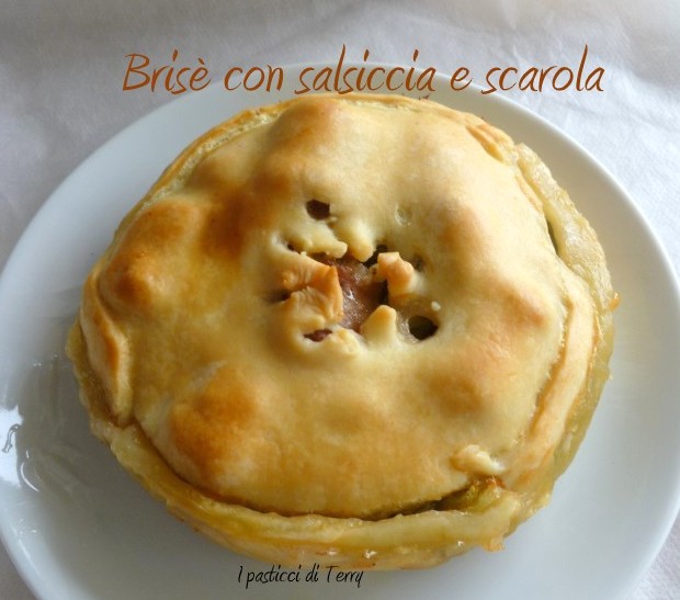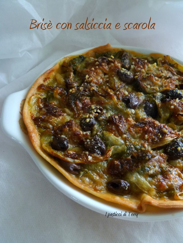 Damiana questa ricetta te lo avevo detto, che l’avrei fatta. Me l’hai fatta sbirciare su Fb e sul tuo blog, facendomi venire l’acquolina e la bava alla bocca. Beh, devo dirti che è strabuona! Naturalmente io l’ho “nordizzata” non avendo le tue olive o i tuoi friarelli. Però ho sbirciato indietro e l’avevi fatta anche tu con la scarola e quindi sono andata sul sicuro. La brisè è fatta da me e la ricetta la trovi QUI. Falla perché delle ricette di Damiana (e di tante amiche blogger che frequento giornalmente sul web) puoi fidarti a occhi chiusi, non si sbaglia un colpo! Quindi eccoti la buonissima Torta Brisè con salsiccia e scarola. Da Damiana ne trovi diverse versioni: QUI, QUI e QUI. Questa è la mia versione.
