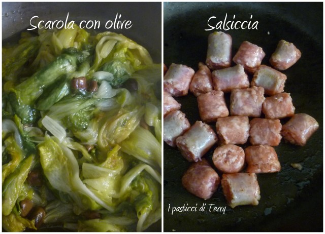 Mondare e lavare la scarola. Rosolare in un capace tegame l’aglio con un giro di olio, aggiungere la scarola, ben sgocciolata dall’acqua. Io l’aglio l’ho tolto ma a gusti, se ti piace, lo puoi lasciare. Far saltare a fuoco vivace, tenendo girato spesso. Salare, pepare e portare a disfare la verdura. Sarà pronta quando avrà riassorbito la sua stessa acqua. Aggiungere le olive taggiasche, far insaporire e spegnere. Lasciar raffreddare. In un altro tegame far rosolare per bene la salsiccia, senza nessun condimento. Deve solo tirare fuori il suo grassetto. Spegnere anche questo.
