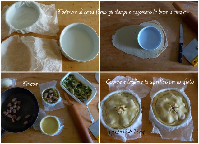 Tirare la Brisè all’altezza desiderata. Io l’ho fatta molto sottile, così ci sono meno calorie e fa solo da scrigno. Due monoporzioni le ho fatte con Brisè sotto e sopra e il ripieno e l’altra invece l’ho lasciata scoperta, come fosse uno scrigno di Brisè. Ho usato della carta forno per foderare gli stampi, se non ti piace, puoi oliare leggermente e usarli senza carta forno. Riempire prima con la verdura e le olive, poi con la salsiccia. Coprire o non coprire, a piacere tuo. Se ti va spolverare di parmigiano grattugiato quella scoperta.
