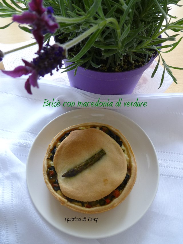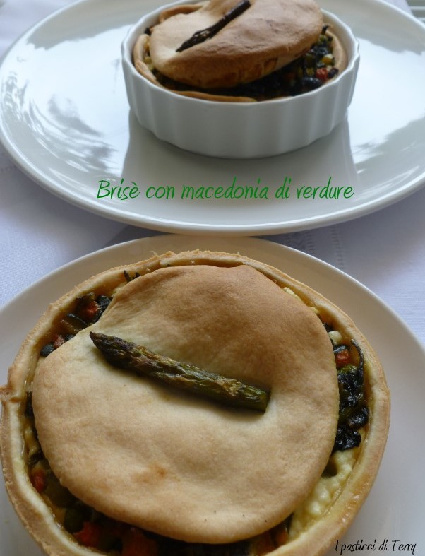 Rimane un tortino semplice e goloso, da mangiare anche tiepido o freddo. Sopra ci ho messo una punta di asparago (che ho surgelato questa primavera) a decorazione, potete ometterla o cambiare tipo di verdura. Il coperchietto sopra l’ho fatto apposta di un centimetro circa più stretto, così dai lati uscirà il vapore della verdura e rimarrà tutto bello croccante. Provate, è molto semplice da fare. Tortini di Brisè con macedonia di verdura.