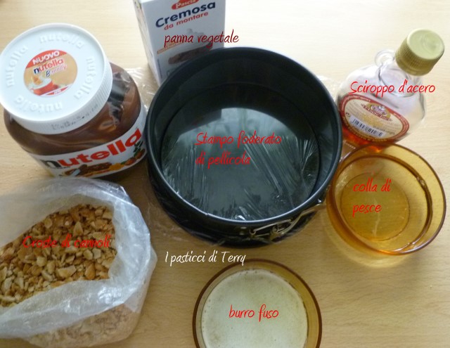 Ora in un’altra ciotola, mettere poca panna di quella prevista, scaldarla al micro onde (o in un pentolino, come volete) e sciogliere dentro la colla di pesce, scolata e strizzata dall’acqua. A questo punto unire l’altra panna fredda e la crema di nocciole. Sbattere bene il composto fino a renderlo una crema. Aggiungere questa crema sopra lo strato di cannoli, che era stato messo in frigo. Far raffreddare bene. Se avete tempo basterà in frigorifero per alcune ore. Se andate di fretta, come me, mettere in freezer per un ora almeno. Al momento di portare il dolce in tavola, sformarlo, metterlo sul piatto di servizio e decorare a piacere.