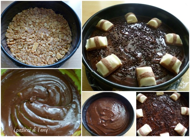 Semplicissima, veloce e molto golosa. Senza cottura e con pochi ingredienti. Credimi se devi fare un dolcetto al volo, è molto golosa e facissima da fare. Devi solo lasciarle il tempo di raffreddare bene in frigo. Prima la base e poi la crema al cioccolato. Io l’ho messa in freezer e poi passata in frigo un oretta prima di mangiare. L’ho decorata con un’altra “porcata” quelle barrette di cioccolato, fatte a pezzetti e delle codette, sempre di cioccolato. Ti consiglio di prendere proprio le croste dei cannoli, si vendono anche al supermercato. Oppure puoi usare anche dei biscotti comuni ma secondo me con i cannoli, acquista quel sapore particolare che fa la differenza. Ecco allora la mia Cheese cake al cioccolato.