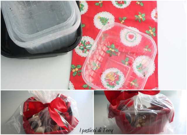 Volevo farvi vedere i miei Pacchettini utilizzati per i Biscotti che ho regalato a Natale. Avete presente le vaschette di plastica, dove in genere vendono la frutta e la verdura? Ecco, durante l’anno ho conservato le più belle, le ho lavate per bene e asciugate. Ho poggiato dentro un tovagliolo di carta rosso e riempito di biscotti e dolcetti fatti da me, tra cui anche questi sopra. Insacchettato e infiocchettato con un bel nastro rosso. Che ne dite, non sono carini? Di riciclo e d’effetto direi. 🙂