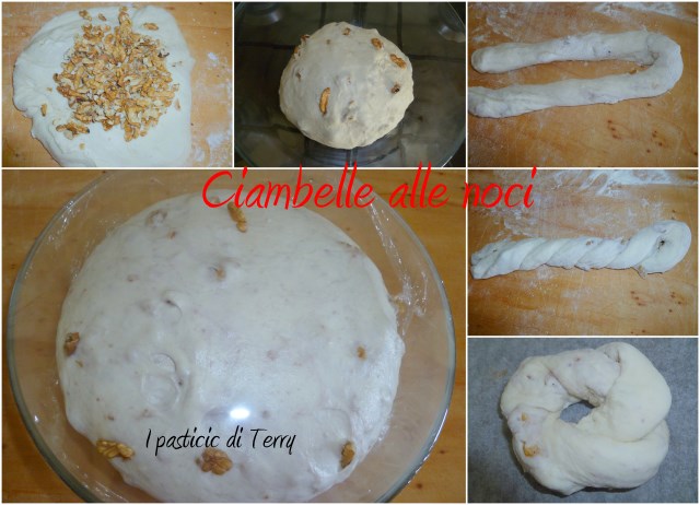 Qui il tempo è sempre indicativo, dipende molto dalle vostre temperature e dalla forza dei vostri lieviti. A me ci sono volute circa sei ore. A questo punto rovesciare di nuovo l’impasto sul piano leggermente infarinato e formare le vostre Ciambelle alle noci. A me ne sono venute 12 con queste dosi. Formare dei rotoli da ogni singolo pezzo, piegare a metà, attorcigliare su se stesso, tenendo con il dito, un buco nella parte dove avete piegato il rotolo, quindi infilare l’estremità opposta e unita, dentro il buro, arrotondando e formando una Ciambella. Mettere su carta forno, direttamente sulla placca del forno e lasciare raddoppiare, a me ci sono volute altre tre ore.