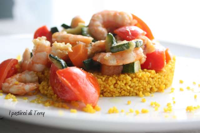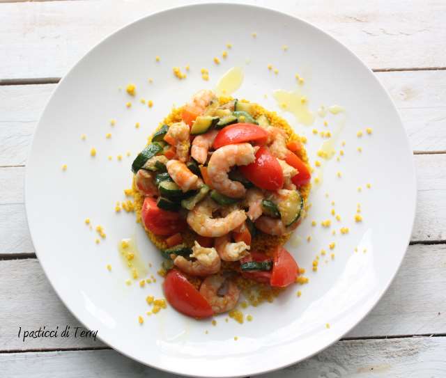 Ciao Terry che bel colore solare il tuo cous cous e con le verdure e gamberetti un vero arcobaleno. Io lo preparo spesso nella versione fredda semplicemente con pomodorini e olive a volte fagiolini ed ai miei bimbi piace molto. Visto che amano anche il gusto particolare della curcuma devo provare a fare questa aggiunta. Grazie dell’idea, bacioni luisa