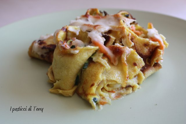 Però potete farcirle come più vi piace; prosciutto e formaggio. Funghi e scamorza. Zucchine e gamberetti. Spazio alla fantasia. Fermo restando la besciamella sopra, visto che per gratinare hanno bisogno di qualcosa che le tenga morbide. Le creps di solito le faccio con gli albumi, visto che ne ho sempre di avanzo.