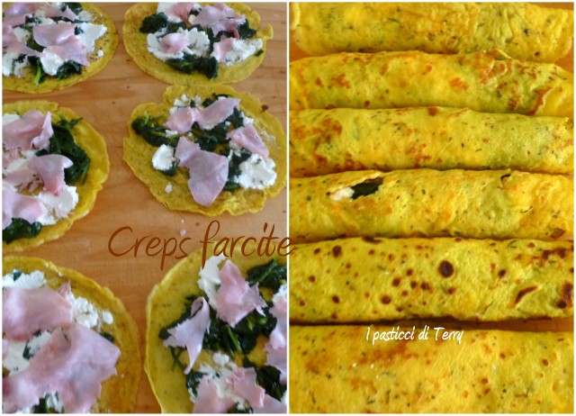 La scena bellissima, da filmare, è stata quella di Christian, mio nipote, che mentre le farcivo (erano le nove del mattino) quando mi ha visto prendere il prosciutto e poi la ricotta, ha cominciato a fare i suoi versetti e ad agitare le manine verso il cibo, con la chiara intenzione di papparsi qualcosa ahahahahh Mio nipote è davvero un gran buongustaio, lui mangerebbe a tutte le ore e mangia tutto! Da quando aveva nove mesi mangia quello che mangiamo noi, magari ben tagliuzzato in pezzetti piccolissimi (visto che ha non ha ancora tutti i denti) ed è un vero piacere verderlo mangiare. Infatti poi si è mangiato una creps intera! La porzione da adulti sono due creps … Eccoti le mie Crespelle farcite
