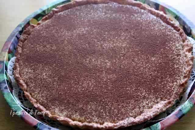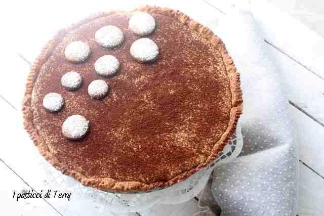 Io ho spolverato di cacao amaro e messo dei biscottini, preparati con la frolla avanzata dai ritagli. Crostata con crema al tiramisù.