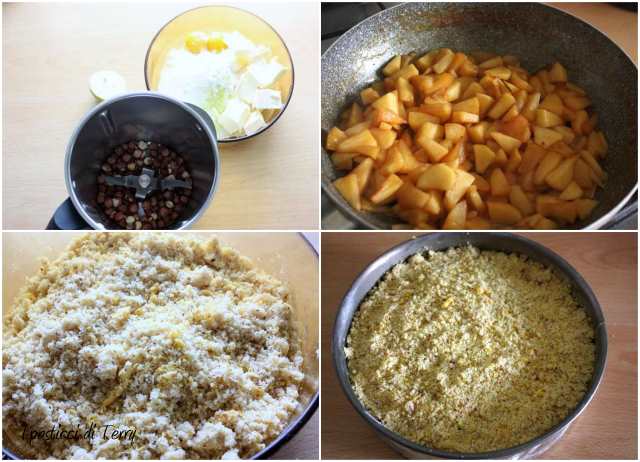 Imburrare e infarinare lo stampo, meglio se a cerniera. Adagiare metà del composto di briciole sul fondo, versare le mele caramellate e ricoprire con il resto delle briciole.