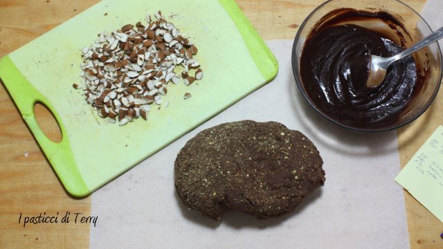 Stenderlo su un foglio di carta forno e, aiutandosi con un altro foglio sopra, stenderlo con il mattarello a uno spessore di un centimetro circa, dandogli la forma di un rettangolo. Sopra spalmare la crema di ciocco castagne. Cospargere con le mandorle tritate in modo grossolano, a coltello.