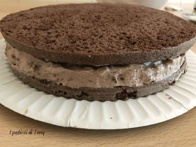 Per la base ho preparato un Pan di Spagna al cacao, usando una teglia da 24 cm. Potete anche usare uno stampo da 22 e dividere la torta in tre parti, anziché due, come ho fatto io. Questo se volete una torta più alta, come preferite.