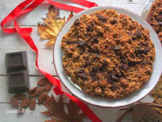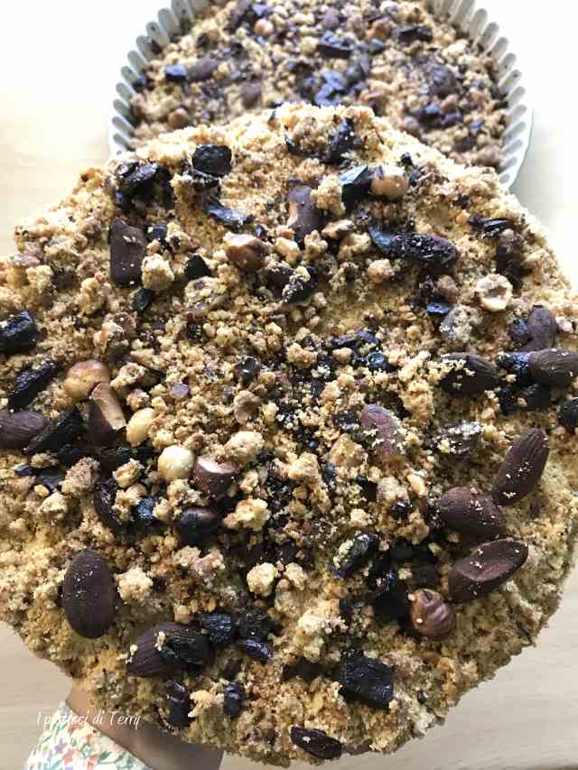 In una ciotola grande unite le farine e lo zucchero. Tritate grossolanamente le nocciole e le mandorle, tenendone da parte alcune per tipo, per la decorazione finale. Aggiungere anche questo trito alle farine. Aggiungere i tuorli, il sale e il burro freddo a pezzetti. Tritare grossolanamente anche il cioccolato e unirlo a questo composto. Impastate velocemente con le mani, fino a ottenere delle grosse briciole. Trasferire queste briciole in uno stampo, imburrato e infarinato. Sopra cospargere con le nocciole e le mandorle, tenute da parte e infornare a 160° per 50 minuti. O, come detto sopra a 180° per 40 minuti.