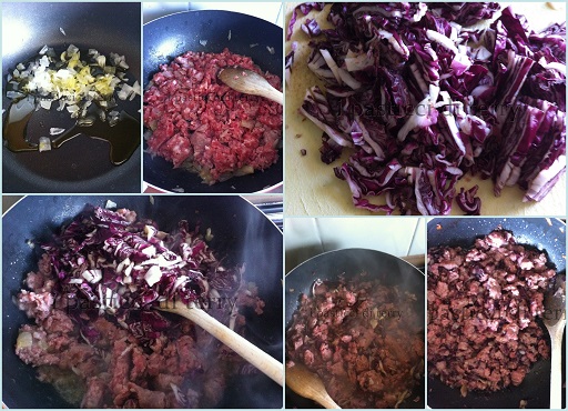 Ho tolto 8 foglie, cercando di sceglierle belle e integre, senza romperle. Il resto l’ho tagliato a piccoli pezzi. In una larga padella ho messo la cipollina affetta sottile a imbiondire e poi gli ho aggiunto la salsiccia sbriciolata. Ho sfumato con del vino bianco e quando è evaporato, ho aggiunto il radicchio a pezzi, coperto e fatto cuocere. Io qui non ho messo nè sale, nè pepe perchè la mia salsiccia era già condita a sufficienza.