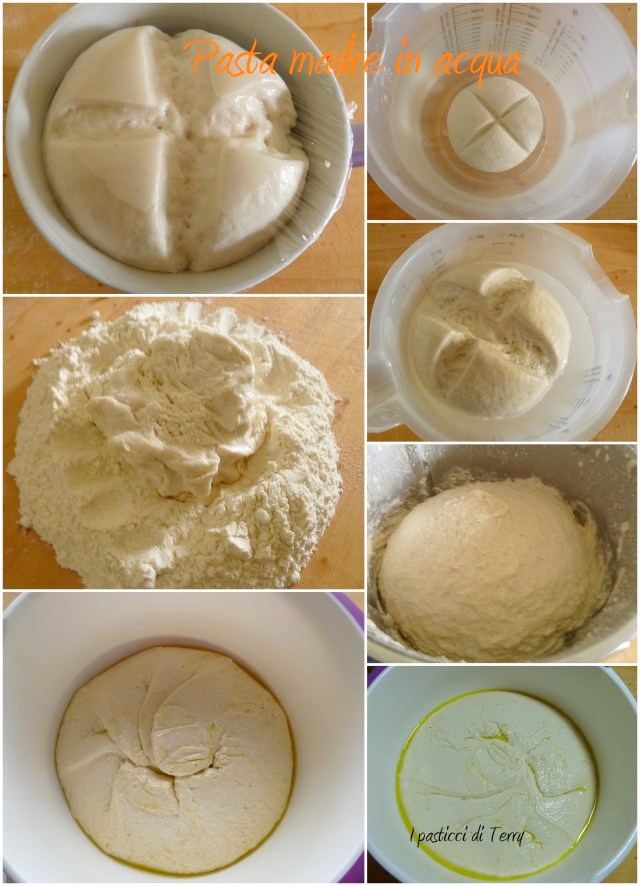 Lui diceva di mettere il lievito in acqua, dopo i primi due rinfreschi normali. Dovrebbe servire a togliere l’eventuale acidità. Nel caso di questa ricetta che voglio lasciarti, diceva di lasciarlo in acqua, per 16 ore circa a 16/18° di temperatura. Ebbene, il mio (cioè il suo) dopo 4 ore tendeva a sciogliersi e allora, l’ho strizzato e utilizzato, fatto un rinfresco con sola farina, fino a raggiungere un panetto molto compatto, facevo fatica a impastarlo. Rimesso di nuovo in acqua e … stesso problema. Ci ho rinunciato! L’ho strizzato, dopo meno di 4 ore e impastato questo pane.