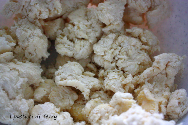 Quando non vedete più pezzi di formaggio o burro nella farina, fermatevi e mettete questo composto in centro a della pellicola per alimenti. Formate un rettangolo, chiudete bene i lati e schiacciate queste briciole, aiutandovi con un mattarello, riempiendo il vostro rettangolo di pellicola.