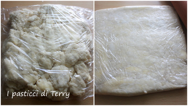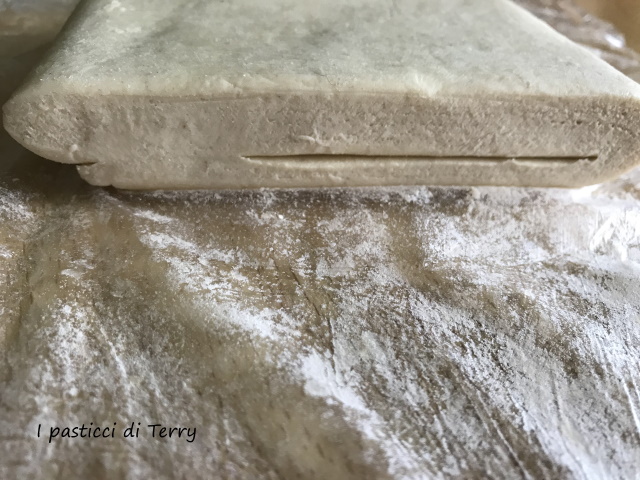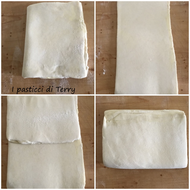 Dopo di che, stenderla sul piano di lavoro, leggermente infarinato, formando un rettangolo più grande. Fare una piega a tre, come in foto. Chiudete di nuovo in pellicola e rimettete in frigo, per circa 30 minuti. Ritepete queste pieghe per altre due volte, tre in tutto. Fate riposare la sfoglia in frigo per almeno 30 minuti ancora, prima di utilizzarla nelle vostre ricette, al posto della classica sfoglia.