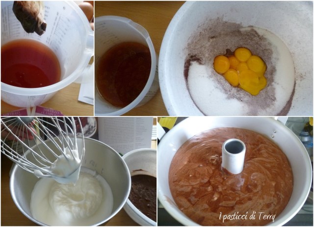 Separare i tuorli dagli albumi. Mettere questi ultimi a montare con il cremor tartaro, usare le fruste fino a renderle a neve ben ferma. Nel frattempo setacciare la farina, il cacao e il lievito in una grande ciotolona. Unire lo zucchero e mischiare bene. Nel contenitore dove avete messo l’infuso, ormai tiepido, unire anche l’olio. Mettere questo composto al centro delle polveri, insieme ai tuorli. Mischiare bene e aggiungere il pizzico di sale. A questo punto gli albumi saranno ben montati e aggiungere anche questi nella ciotolona, insieme al resto. Fate attenzione a non smontare il tutto, sollevate e inglobate gli albumi, poco alla volta.