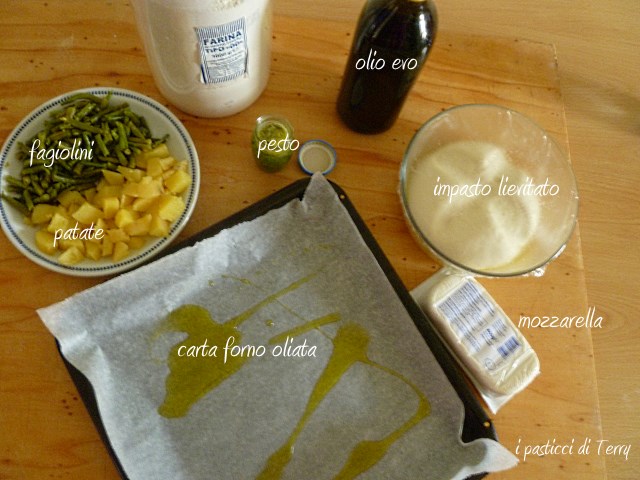 Questo genere di focaccia la faccio come ho visto fare, tante volte, a Bonci in televisione, alla Prova del cuoco. In pratica, metto un foglio di carta sulla placca del forno, metto un giro di olio, le verdure che intendo utilizzare (in genere già cotte) e sopra posiziono l’impasto già lievitato. Naturalmente si serve rovesciato. Ecco qua la mia Focaccia patate fagiolini e pesto.