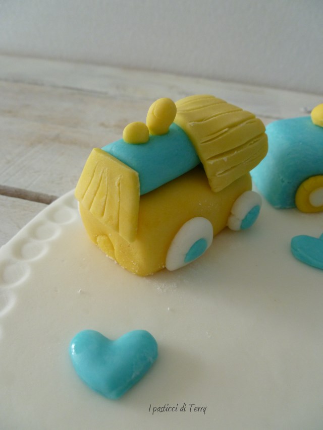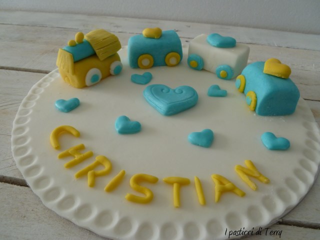 Caspiterina, tra poco ore è di nuovo venerdì … ma come vola il tempo? Domenica scorsa c’è stato il battesimo di Christian, il mio nipotino. Avendo fatto la festa in un locale io ho potuto preparare solo il topper della torta. Ci tenevo, volevo fare qualcosa che poi gli rimaneva per ricordo. Ho pensato a un trenino, non mi sono inventata niente, ho guardato su you tube e ho trovato molti tutor per fare i vagoncini e la locomotiva. Poi, con un po’ di fantasia, si è costruito da solo; metti un cuoricino lì, uno un po’ più grande al centro ed ecco qua: