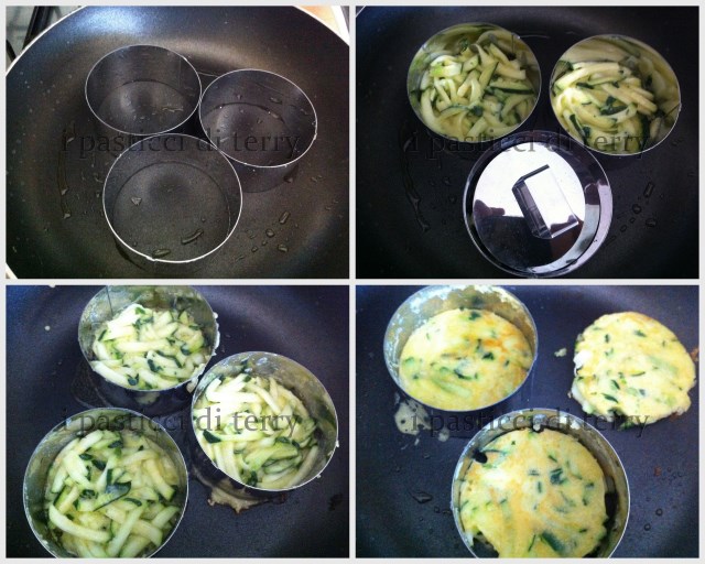 Ho spennellato una padella antiaderente con poche gocce di olio extra vergine di oliva, ho posizionato sopra tre coppapasta (così verranno tutte della stessa forma) e messo all’interno una cucchiaiata di composto alle zucchine. con l’attrezzino del coppapasta ho pigiato per far bene aderire le mie frittelle, se non lo avete andrà bene anche con il cucchiaio.