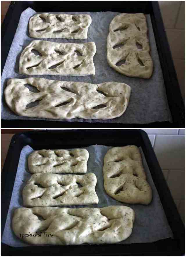 Riprendere l’impasto, infarinare leggermente il piano di lavoro, rovesciare l’impasto e dividere in 6 parti. Dare una forma regolare, aiutandosi con le mani. Sistemare i pani sulla placca del forno, rivestita di carta forno. Fare dei tagli a spiga, caratteristica di queste Fugasse. Lasciar lievitare per circa 1 ora.