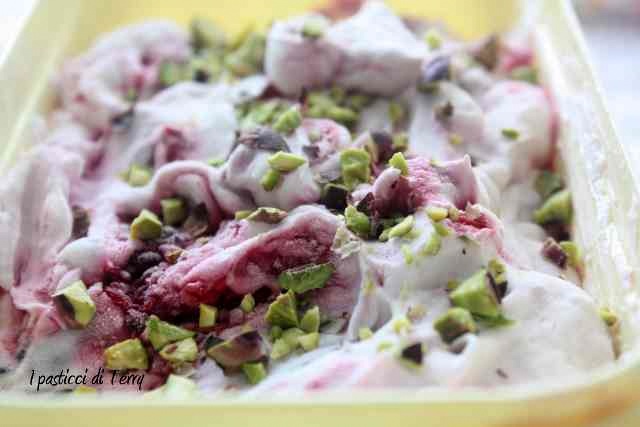 Aggiungere i frutti di bosco interi e i pistacchi e amalgamare bene. Unire la composta di frutti di bosco, ormai fredda e girare appena con la punta di un coltello, così otterrete l’effetto variegato.