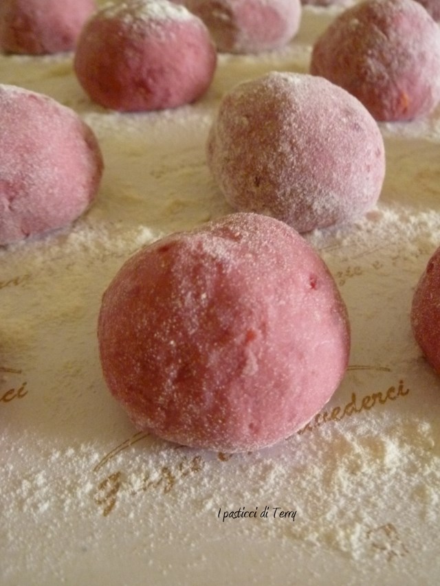 Oggi gnocchi per tutti, ci eravamo dette ieri ^_^ Ecco qui i tuoi. Non amo la barbabietola, ma la forma con il goloso ripieno mi piace molto. Non ho mai cucinato così le patate: la tradizione di famiglia mi porta sempre alla classica patata bollita con la buccia e sbucciata soffiando sulle dita scottate ^_^
