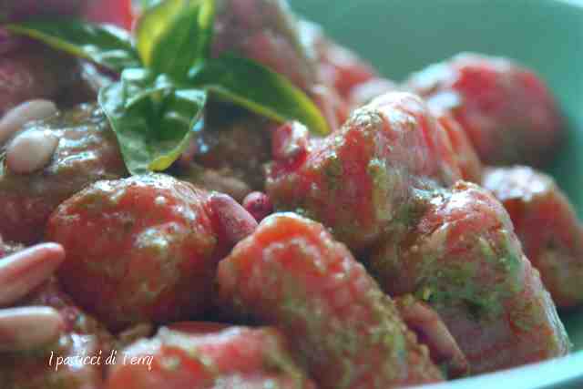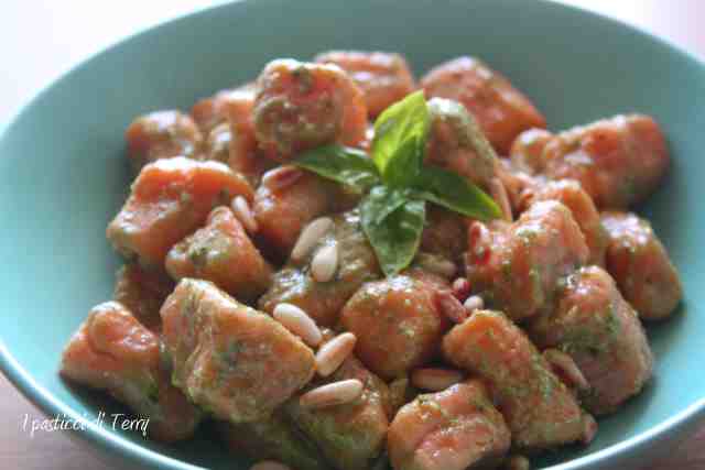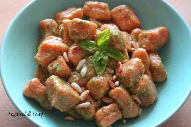 Gnocchi rossi con pesto e pinoli. L’altro giorno ho preparato delle salsicce al sugo con la polenta. Mi era avanzato poco sugo e siccome non amo sprecare il cibo, ho pensato di metterlo nell’impasto degli gnocchi. Così, oltre al sapore, gli avrebbe conferito un bel colore rosso, secondo le mie aspettative. Diciamo che il colore non è proprio rosso ma il sapore è ottimo e si sente il sughetto. Ho deciso di condire questi Gnocchi rossi con del pesto, poco non molto. E arricchire tutto con dei pinoli, appena tostati. Devo dire che sono buonissimi? Non credo sia necessario ma ve lo dico lo stesso: buonissimi! Gnocchi rossi con pesto e pinoli.