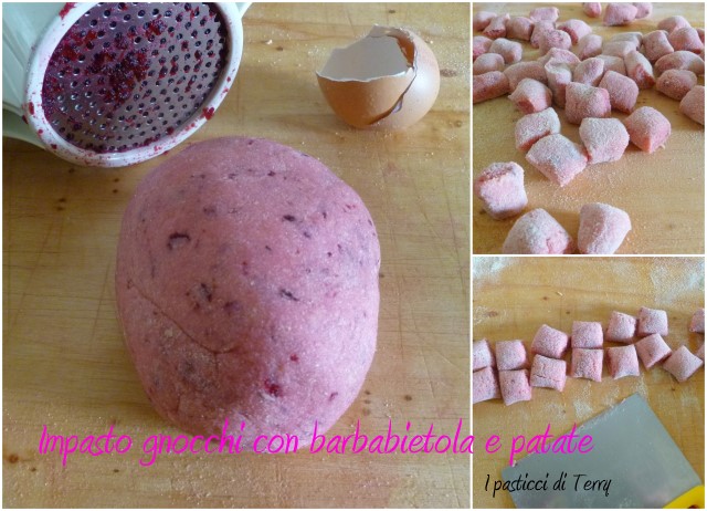Lessare le patate, dopo averle ben spazzolate e lavate. Una volta cotte, spolverare di semola di grano duro il piano di lavoro e schiacciare le patate, ancora calde, con un passapatate a fori piccoli. Lasciar intiepidire. Passare anche la barbabietola, dopo averla mondata e lavata, direttamente sopra le patate, ormai fredde. Fare la fontana e mettere al centro il tuorlo d’uovo. Impastare aiutandosi eventualmente con altra semola di grano duro. Cercare di usarne meno possibile. Se le patate sono a pasta dura, cioè adatte ai gnocchi, ne basterà davvero poca. Formare un panetto e da questo tagliare dei pezzi, tirando dei rotolini, grossi più o meno due centimetri di diametro. Formare gli gnocchi tagliando a misura che volete. Spolverare bene di semola, per evitare che si attacchino al piano.