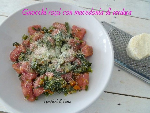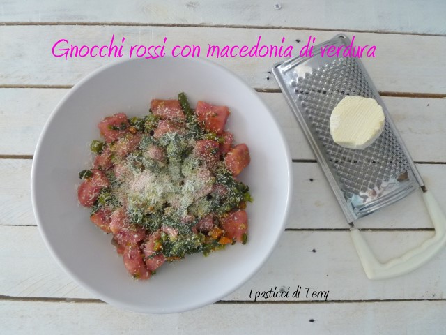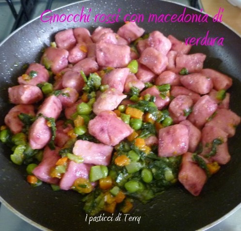 Per il condimento di questi Gnocchi rossi, io ho utilizzato una macedonia di verdure fresche. Vi elenco sotto negli ingredienti, quelle da me usate ma potete mettere le verdure che preferite. Io lo faccio spesso, mi piace un sacco questo tipo di condimento, sia sui primi piatti ma anche nelle torte salate o anche come contorno.